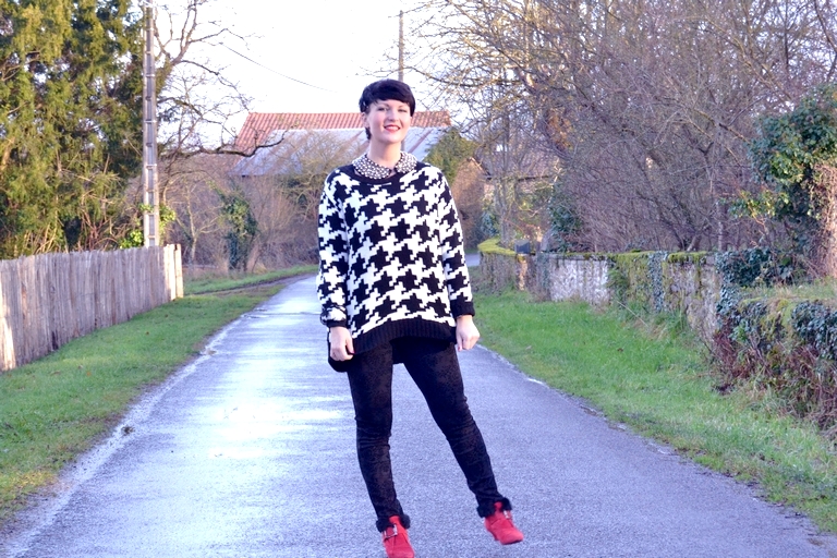 En attendant je vous un look OMG, composé à la va-vite en vacances chez pôpô et môman!! Du coup, je suis allée faire ma voleuse dans le dressing de ma petite soeur bien aimée!! Je lui ai chipé ce pull oversize pied-de-poule géant, ce qui est légèrement différent du pied-de-coq, les pointes sont pas tout à fait pareil... Moi je trouve que cela ressemble à une farandole de petits bonhommes, non??